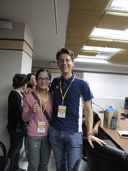 看到義大利選手伊凡庫丁了,笑臉迎人(真的今年整場只有他笑一整路的),說明會結束,讓北醫團隊做了心電圖檢測,賽前一次,賽後一次,賽後一天再一次(真的南下到嘉義幫我做檢測),躺著5分鐘,坐著10分鐘,站著3分鐘,在脖子左邊貼了兩個貼片,左側劍突平行外側也貼了兩個貼片,機器只有三台,輪流做。