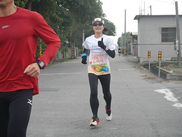 穿太多的情況就是沒風的地方,冒大汗,只好把頭巾取下,繫在右手腕上,跟著許多選手的背影跑著,莊壽進大哥、賁姐的紅揹巾(三百馬)、民雄陳老師、小戴姐……,跟著跟著,想到:冬天有速度的跑著真的很過癮!滿滿冷冽的腦內啡,很爽快!
