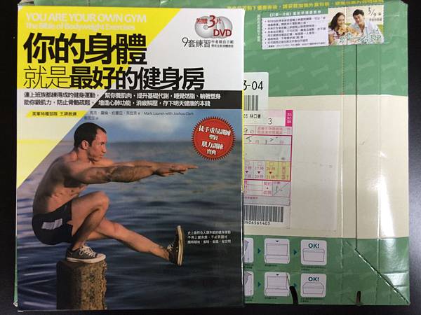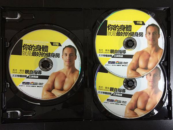 最好的是還附了三張DVD分初階、中階、進階,就好像馬克‧羅倫(Mark Lauren)親自指導教你做健身,我很認真看完,馬克一口氣做完四回合(循環練習),附中文介紹,成功的祕訣在於恆心、毅力。